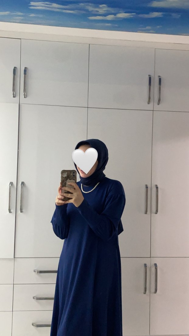 Lacivert renkte, yüksek yakalı ve uzun kollu, ipeksi dokulu, rahat kesimli kadın midi elbise , zahmetsiz şıklık sunar.