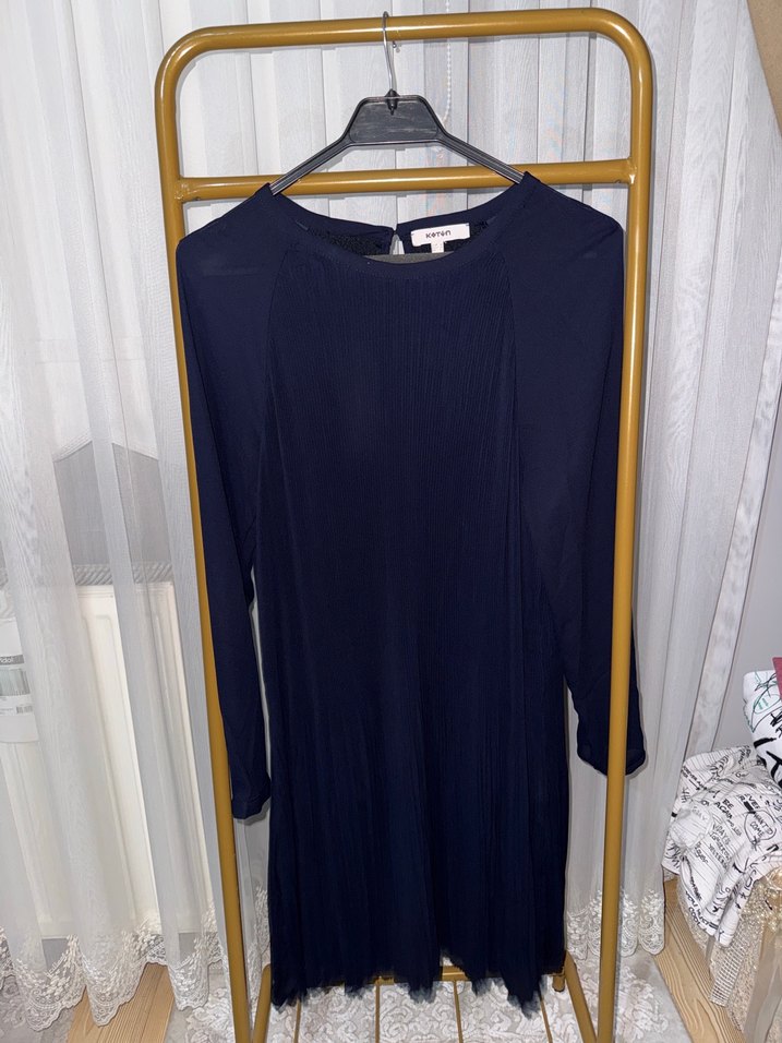 Lacivert renkli kadın elbise uzun kollu ve yuvarlak yakalıdır. Keten kumaştan, bol kesim ve pliseli detaylarla günlük kullanıma uygundur.