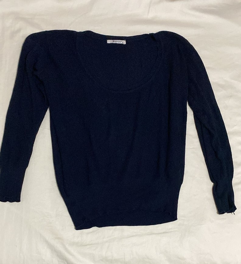 Lacivert renkte, uzun kollu ve yuvarlak yaka kadın triko kazak. Yumuşak keten dokusu ve salaş kesimiyle günlük sokak stili için uygundur.