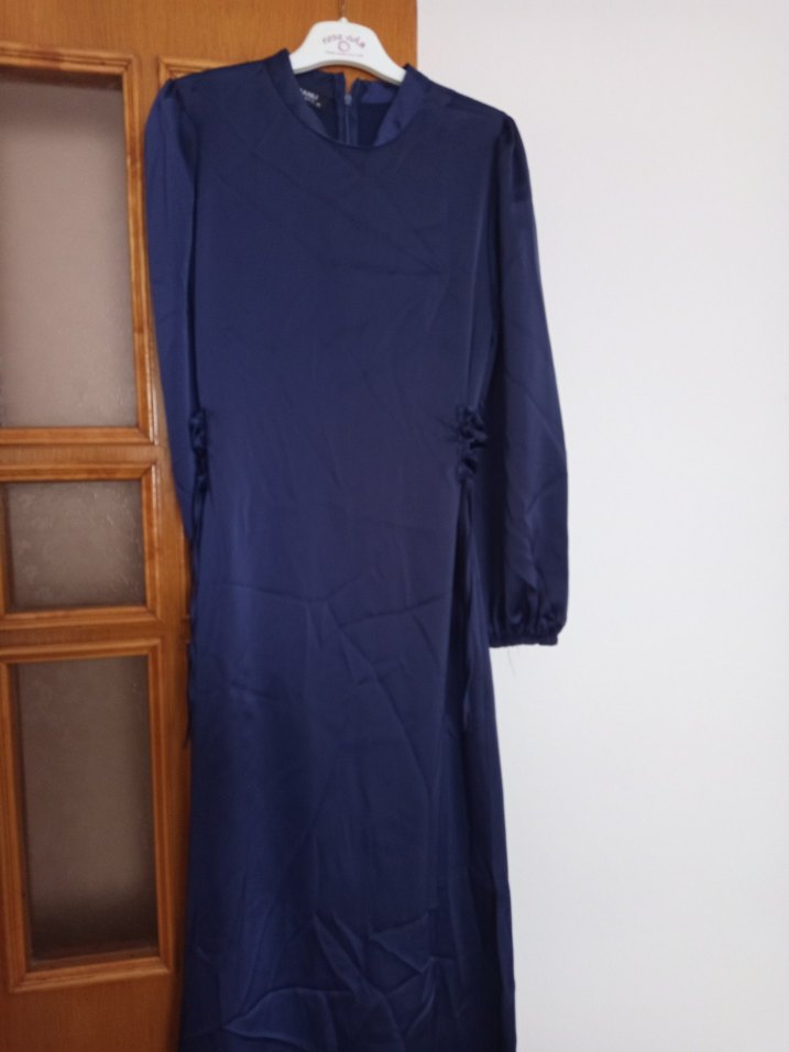 Lacivert uzun elbise, uzun kollu ve yuvarlak yakalıdır. İpek gibi kumaştan, rahat kesimle ve drapeli detaylarla ofis için uygun, sade vintage tarzda tasarlanmıştır. ✨