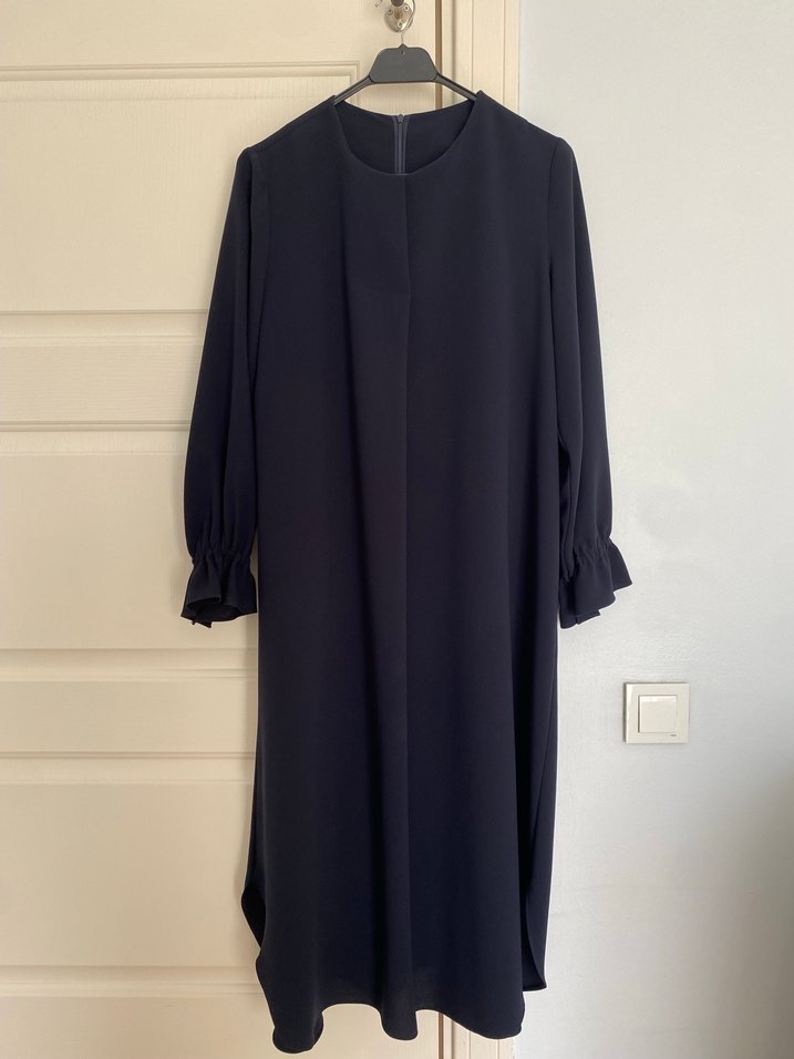 Armağan 2 beden tunik. Lacivert renk, uzun kollu, bol kesim ve drapeli detaylara sahip uzun elbise. Sentetik kumaştan üretilmiş, yuvarlak yaka ve minimalist ofis tarzında.