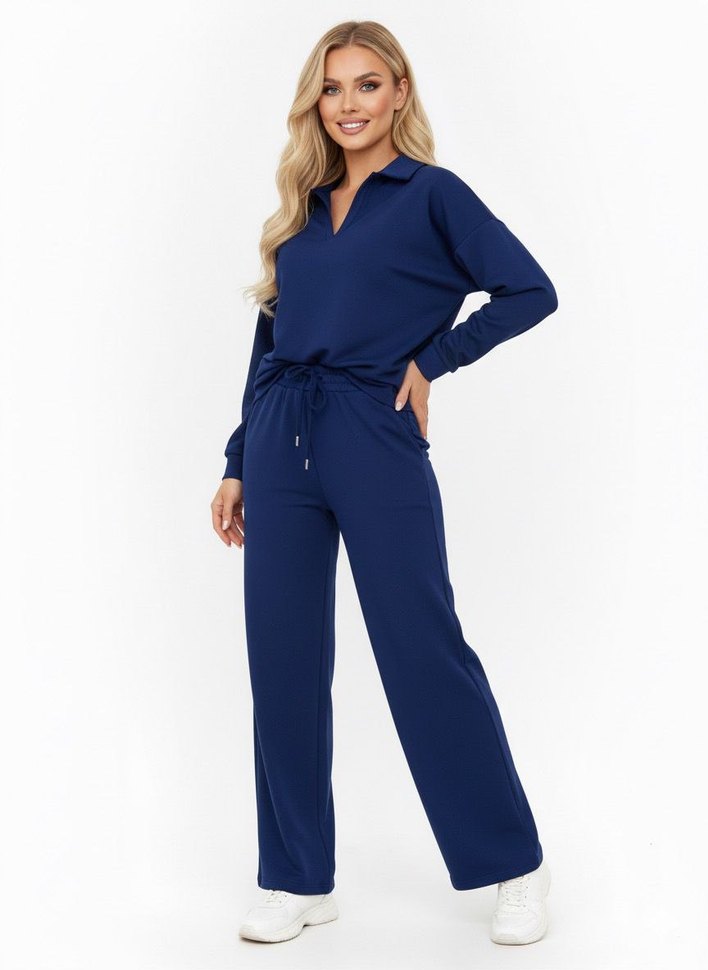 Lacivert renk, bol kesim, uzun kollu ve V yakalı kadın eşofmanı, yumuşak ve sıcak kumaştan üretilmiş, günlük kullanım için rahat ve şık görünüme sahip.