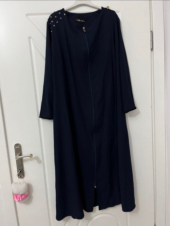 Lacivert renkte, uzun kollu, salaş kesimli ve drapeli uzun ferace. Notlu yaka detayı ve ipeksi dokusuyla günlük kullanıma uygun.