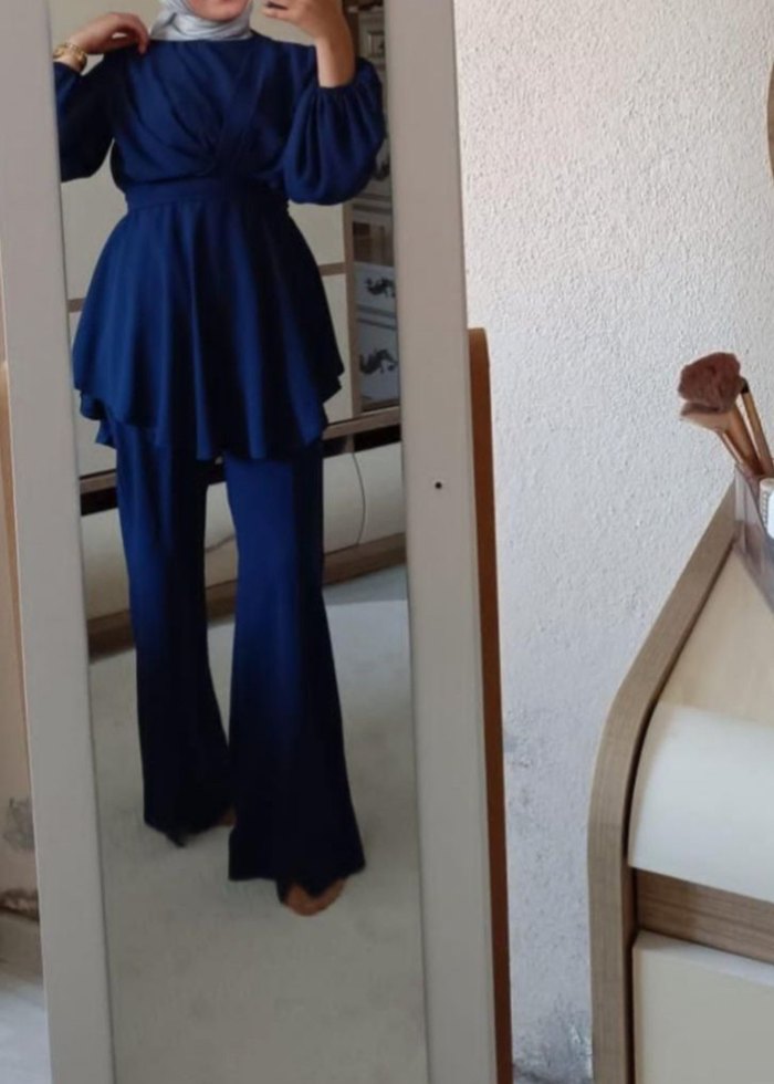 Lacivert uzun kollu üst ve regular fit pantolondan oluşan kadın takımı. Yumuşak sentetik kumaştan, ofis için uygun.
