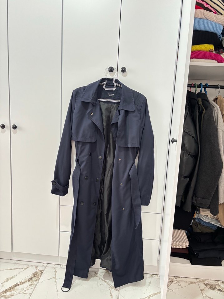 Lacivert uzun kadın trençkot, keskin yaka ve kemerli bel detayıyla. Pürüzsüz sentetik kumaştan, regular kesim ve askılı kollu, rahat sokak stili için uygun. ️giymedim hiç