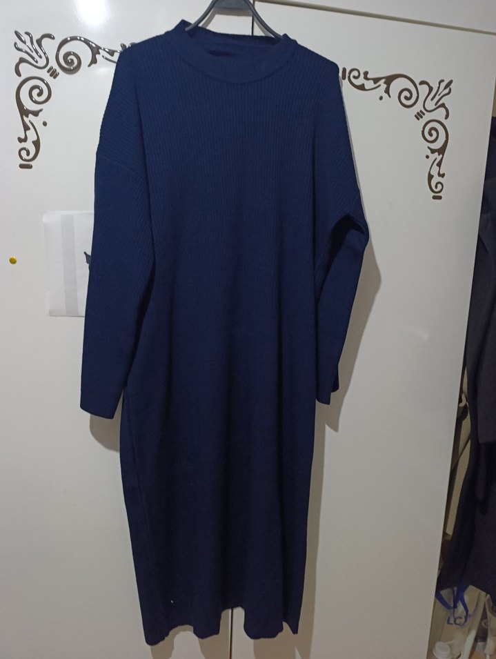 Lacivert renkte, uzun kollu, yüksek yakalı, bol kesim ve örme dokulu bu uzun elbise, sade ve minimalist tarzda günlük kullanıma uygundur. elbisenin boyu 130 cm hiç giyilmedi