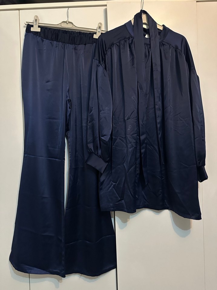 Lacivert renkte, uzun ve salaş kesimli kadın takımı üründe ütü yanık var bu yüzden satıyorum fotoğraflarda belirtilmiştir