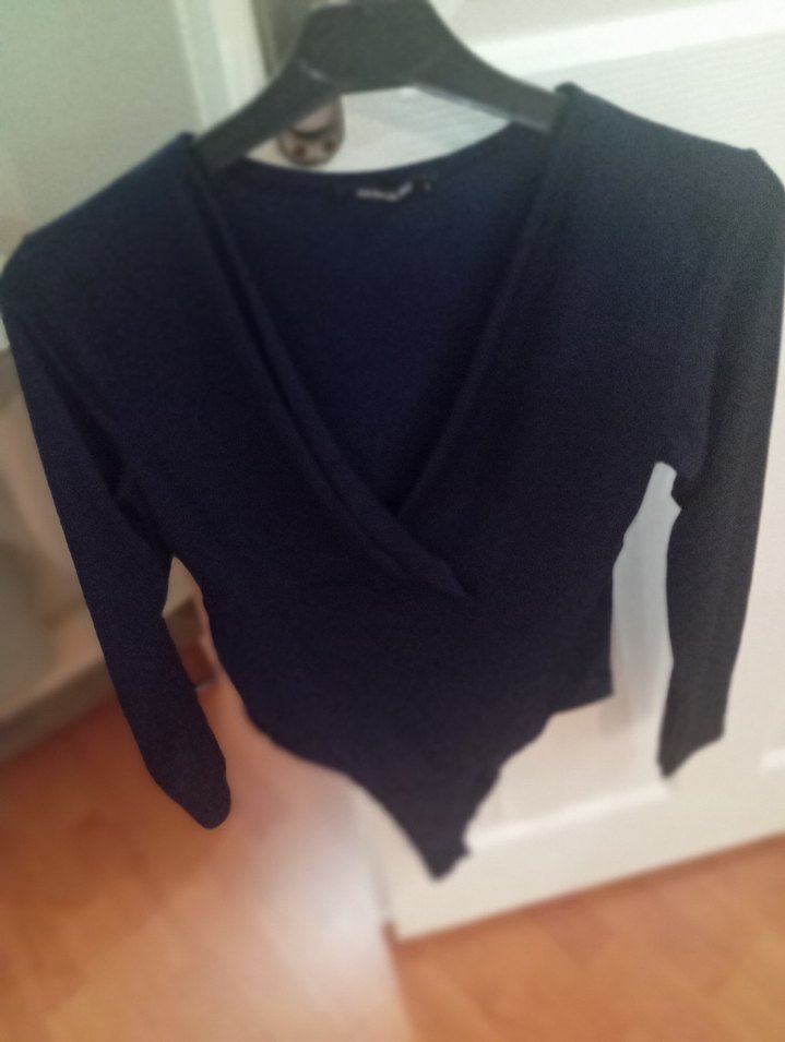 V yaka ve uzun kollu, lacivert renkli, vücuda oturan midi uzunluğunda kadın bluz. Pürüzsüz sentetik kumaştan, sade tasarımıyla zahmetsiz şıklık sunar.
