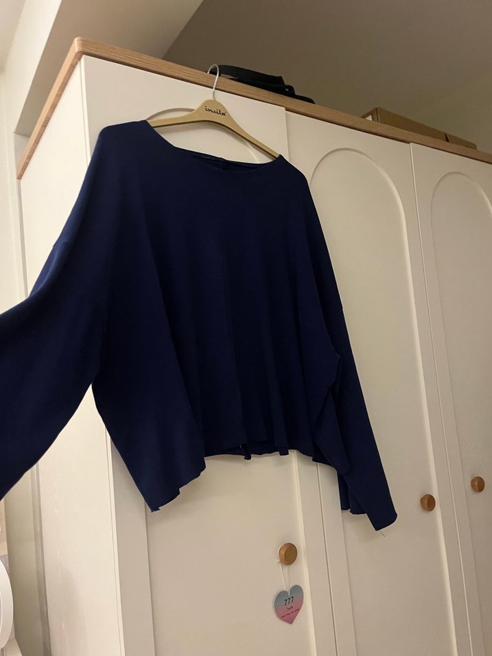 Lacivert, yün kumaştan, uzun kollu, salaş kesim ve bisiklet yakalı. Dökümlü, desensiz ve midi boyda, günlük rahat kullanım için uygun.