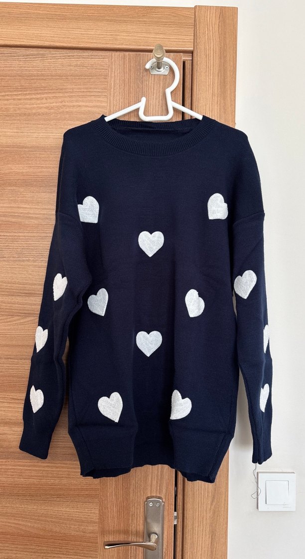 Uzun kollu, bisiklet yaka, beyaz kalp desenli lacivert triko kazak. Bol kesim ve normal boyda, rahat bir görünüm sağlar.