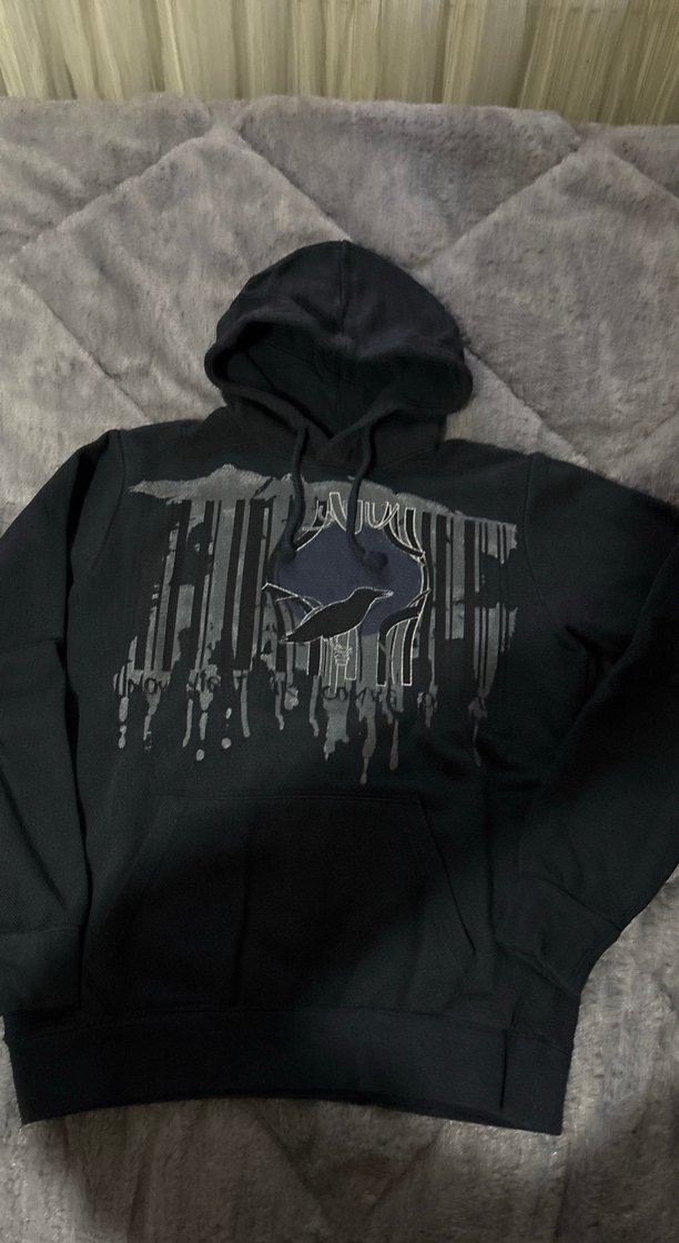 Siyah kapüşonlu sweatshirt, baskılı ve fermuarlı detaylıdır. Uzun kollu, bol kesim ve yumuşak, sıcak kumaşlıdır.