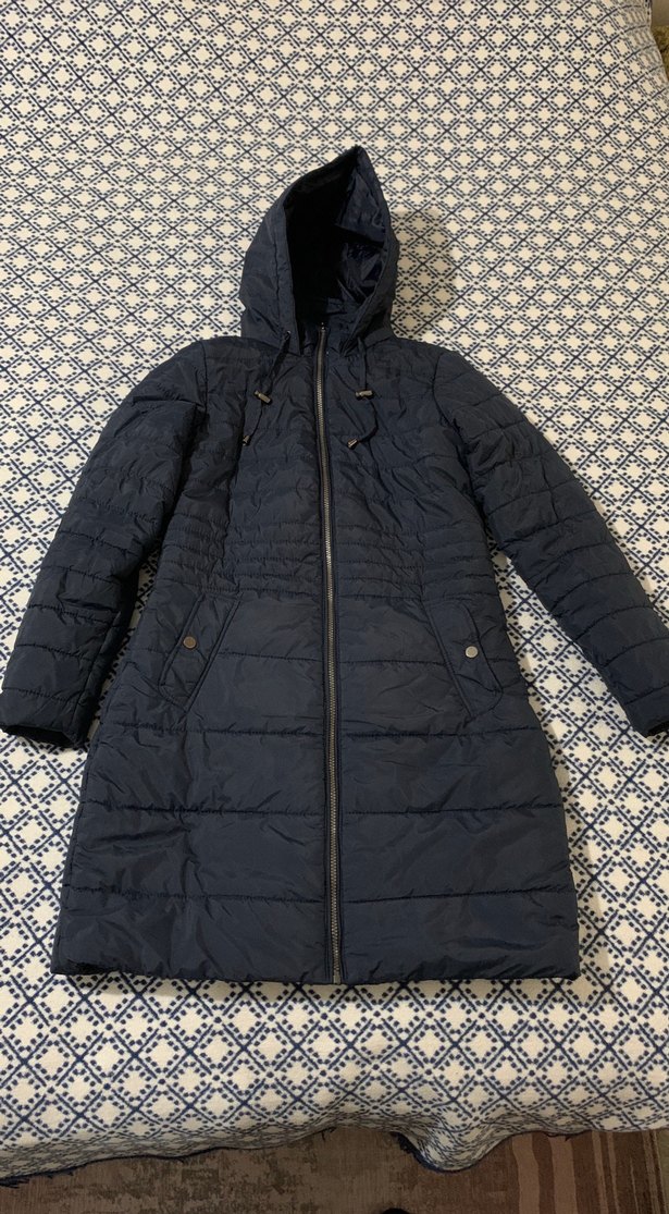 Lacivert renkli, kapüşonlu, uzun kollu kadın kışlık mont. Fermuarlı ve çıtçıtlı cepleri bulunan, rahat sentetik kumaştan üretilmiş günlük kullanıma uygun mont. diz üstü boydadır