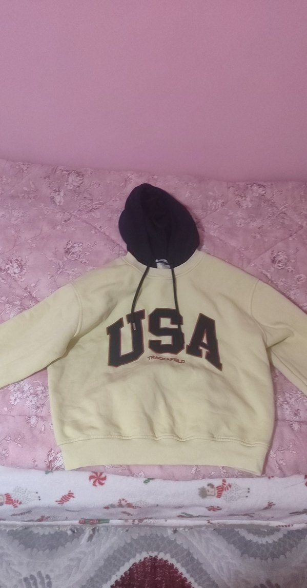 Yumuşak ve rahat kumaştan, kapüşonlu, uzun kollu, bol kesim beyaz sweatshirt. Önünde "USA" yazısı bulunur, gündelik kullanım için uygundur.
