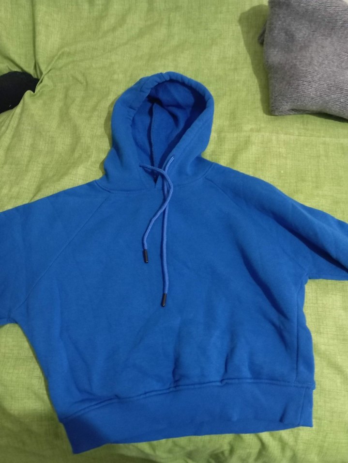 Mavi renkte, uzun kollu ve kapüşonlu kadın sweatshirtü. Yumuşak kumaştan, rahat kesim ve günlük kullanıma uygun şık bir tasarım.