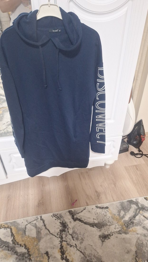 Lacivert kapüşonlu kadın sweatshirt, dar kesim ve uzun kolludur. Kolda baskılı detay ve yumuşak, sıcak kumaş kullanılmıştır. Günlük sokak stili için uygundur. kusuru yoktur.