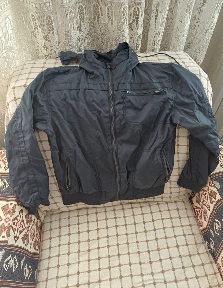 Lacivert renkte, kapüşonlu erkek çocuk mont. Rahat kesim, sentetik kumaştan yapılmış, fermuarlı cepler ve ön kapama özelliği bulunur.