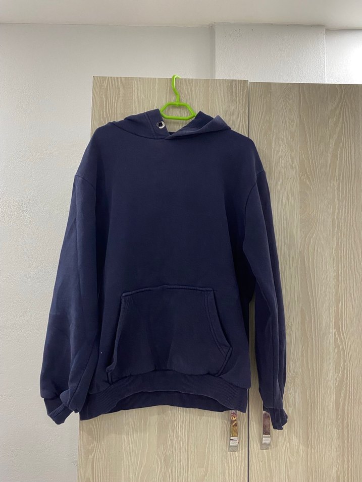 Lacivert kapüşonlu, uzun kollu, rahat kesim sweatshirt, günlük kullanım için yumuşak kumaştan.