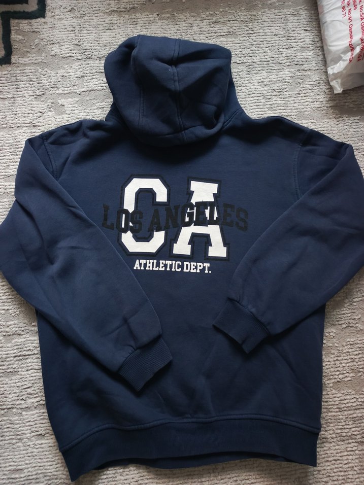 Lacivert kapüşonlu sweatshirt, bol kesim ve uzun kolludur. Önünde baskılı 'Los Angeles Athletic Dept.' yazısı vardır. Yumuşak ve sıcak kumaştan üretilmiştir Unisex ürün.