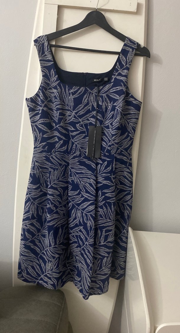 Lacivert renkte, v yaka ve kolsuz, pilili detaylara sahip midi boyda baskılı elbise.