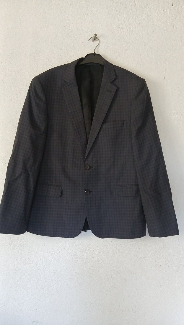 Lacivert kareli erkek takım elbise ceketi, düğmeli, klasik yakalı ve normal midi boyda, ofis için uygun, uzun kollu, rahat kesim şık bir parçadır. ️