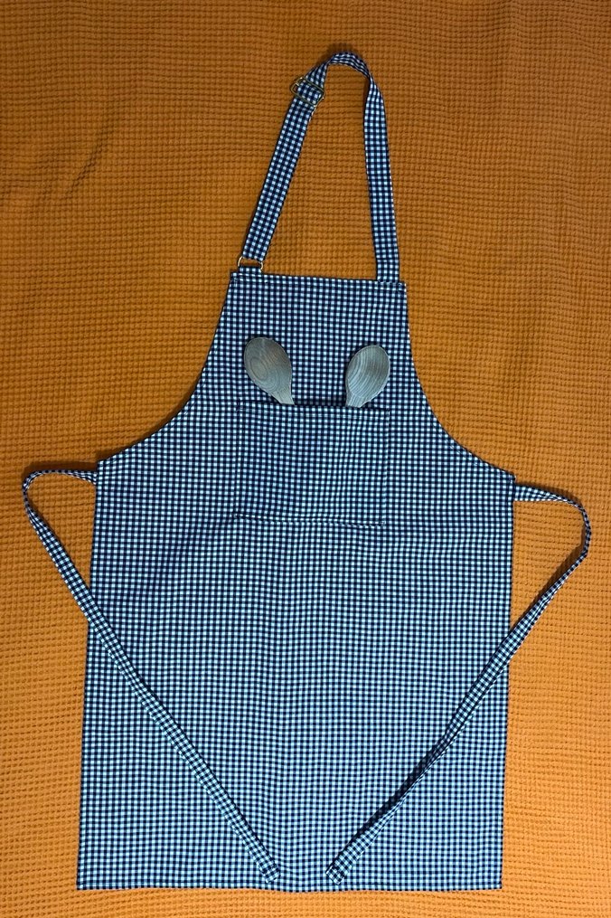 Ayarlanabilir boyun askısı ve uzun bağcıkları olan lacivert kareli mutfak önlüğü Ön cepli