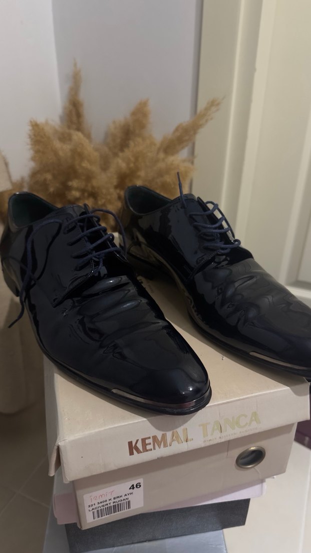 Lacivert rugan görünümlü erkek klasik ayakkabı, ofis kullanımı nişan düğün nikah takım için uygundur. İki kere nişan ve çekim günü kısa süreli giyildi. Sıfır ayarında deformesi yoktur 45 numara