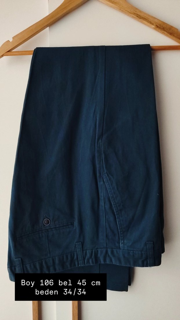 Lacivert kot pantolon, kemerli ve normal kesim. Bel 45 cm, boy 106 cm. Ofis ve günlük kullanıma uygun.