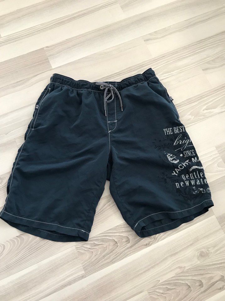 Lacivert, kemerli, bol kesim erkek mini mayo. Beyaz baskılı yazı detayları ve ayarlanabilir bağcık içerir. Plaj ve günlük kullanım için uygundur.