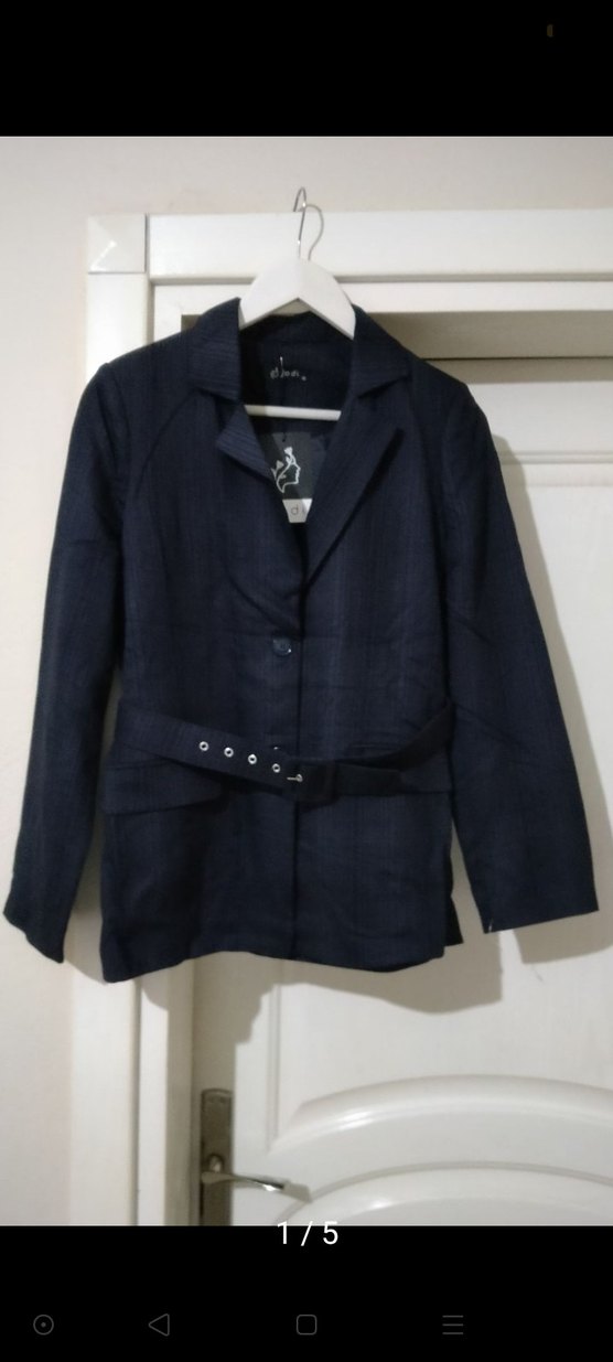 Lacivert renkte, kemerli ve klasik yakalı kadın blazer ceket. Uzun kollu, normal kesim ve sentetik kumaştan üretilmiştir. Ofis ve günlük kullanıma uygundur.