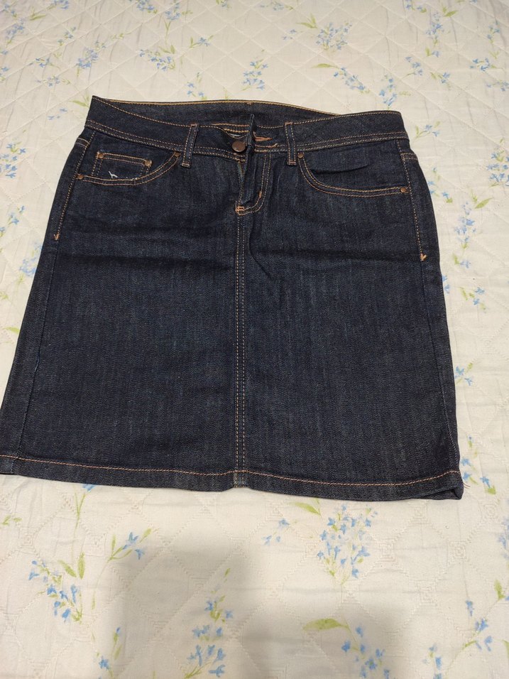 Lacivert renkli, kemerli ve normal boyda, dar kesim kadın denim mini etek. Günlük sokak tarzına uygun sade tasarım