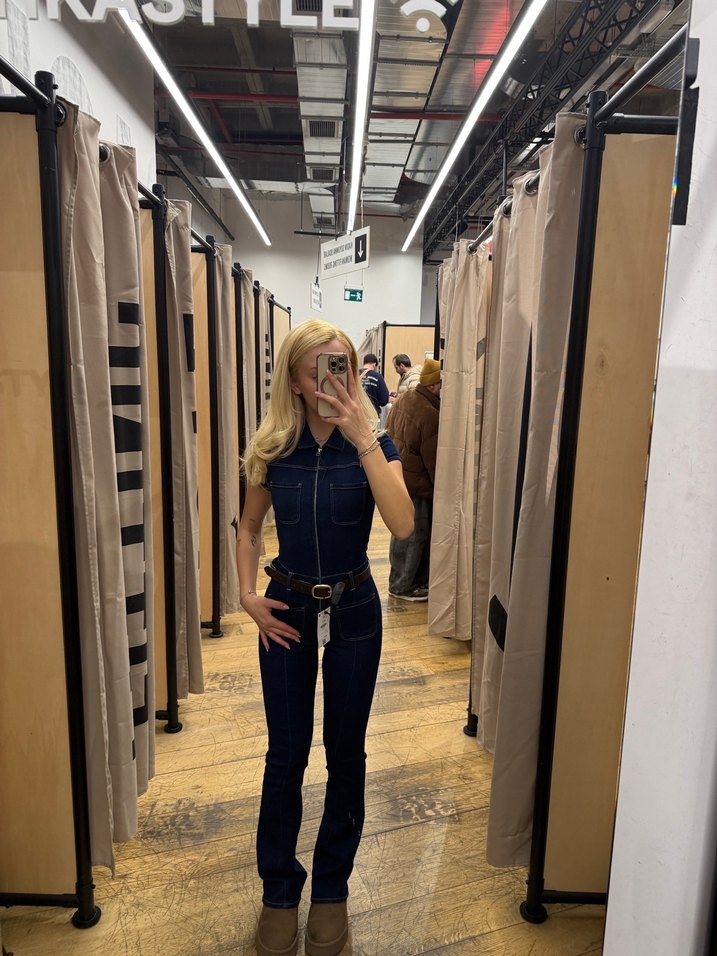 Bu dar kesim kadın tulum, düz yakalı ve kısa kolludur. Koyu lacivert denimden üretilmiş olup kemerli bel detayı vardır. Günlük sokak stili için uygundur.