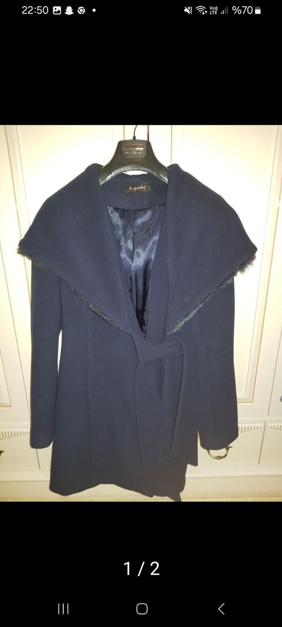 Lacivert renk, geniş yakalı ve kemerli kadın kaban. İç kısmı saten astarlı, uzun kolludur.