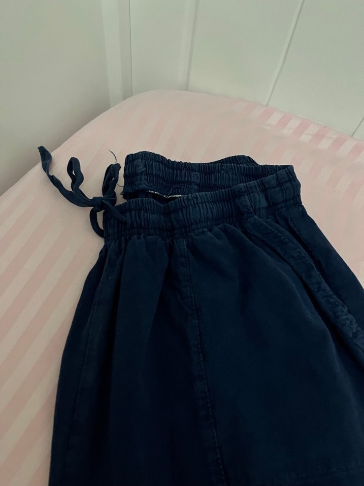 Lacivert keten kumaştan, kemerli, bol kesim Minimalist sokak stili için uygun, günlük kullanıma ideal.