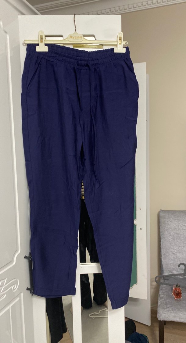 Lacivert Kemerli Kadın Keten Pantolon
