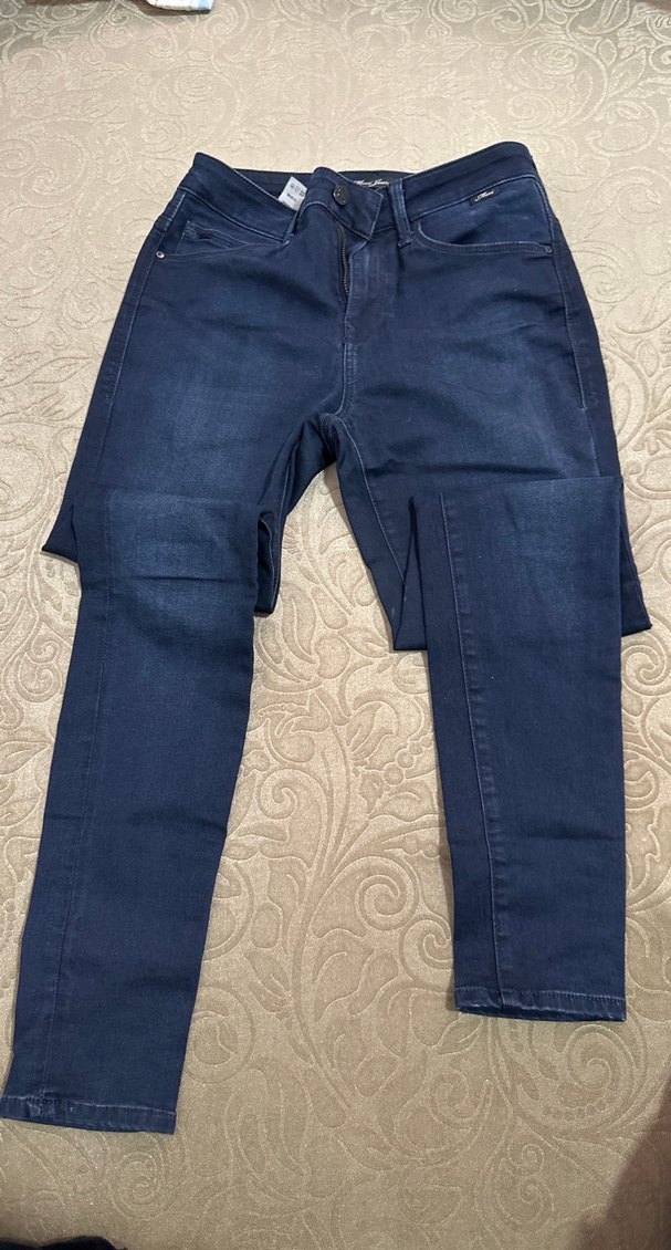 Lacivert kot kumaştan, kemerli ve fitted kesime sahip midi uzunlukta kadın kot pantolon, günlük kullanıma uygundur.