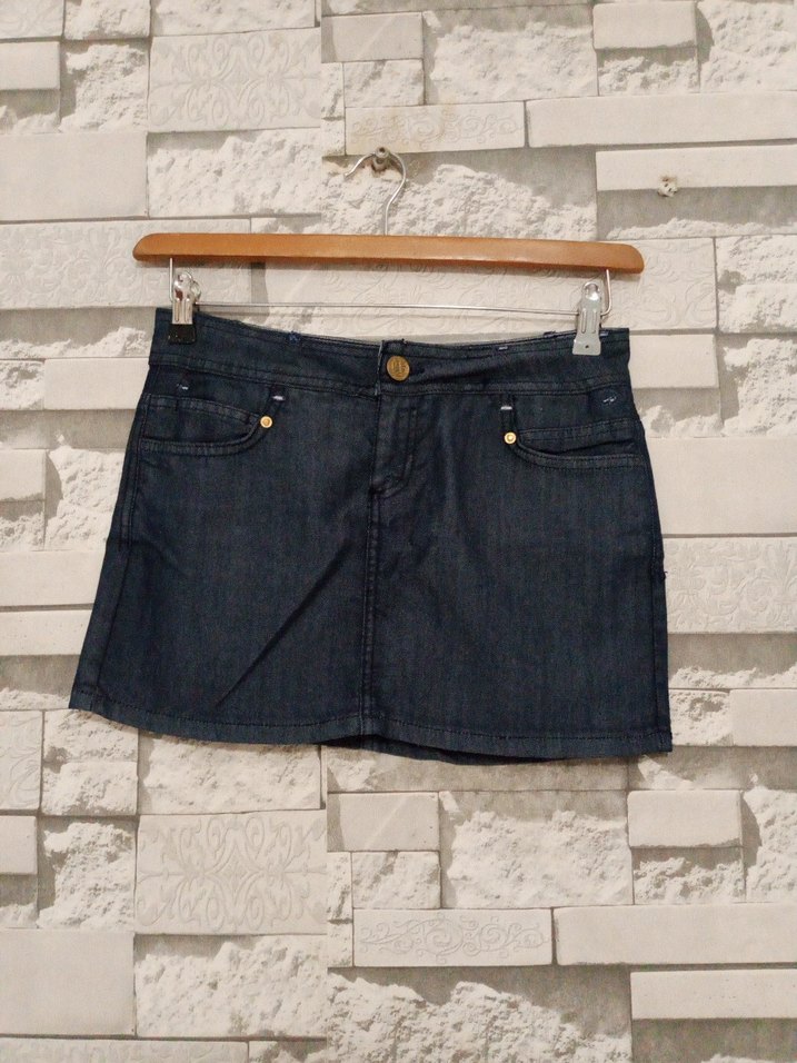 Lacivert kot kumaştan, kemerli ve dar kesim olan bu mini etek günlük sokak tarzına uygundur.