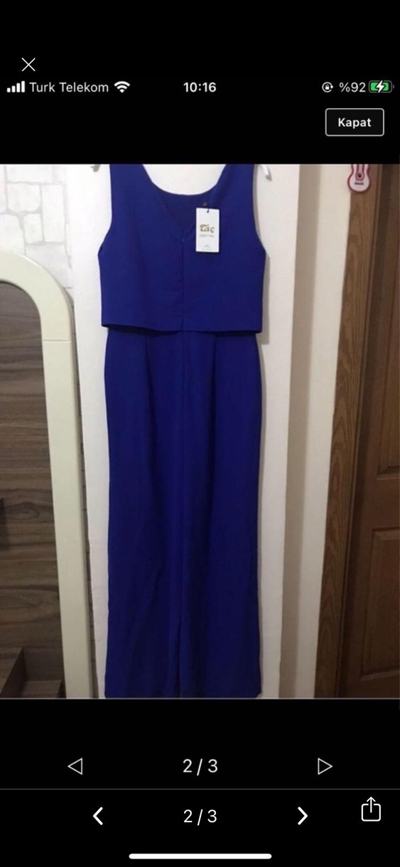 Lacivert renkli, kolsuz ve bisiklet yaka kadın tulumu, kemerli bel detayıyla minimalist ve modern bir görünüm sunar. Ofis kullanımı için uygundur.
