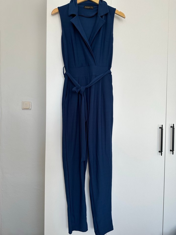 Lacivert renkte, kemerli ve yakalı, ince askılı uzun tulum. Rahat kesimli, sentetik yumuşak kumaştan, ofis için uygun şık tasarım. ✨
