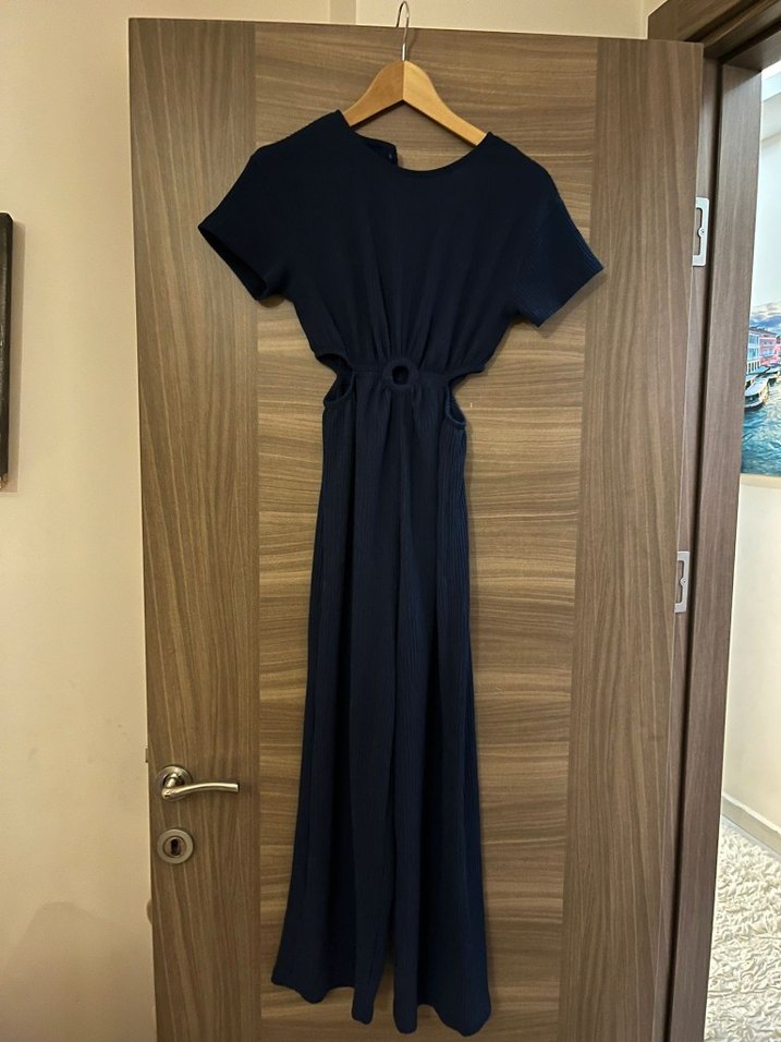 Kadın lacivert uzun keten tulum, bisiklet yaka ve kısa kollu. Kemerli bel detayıyla minimalist ve trend görünüme sahip, romantik akşamlar için uygun. Zara kız çocuk 13-14 yaş yanları dekolteli tulum