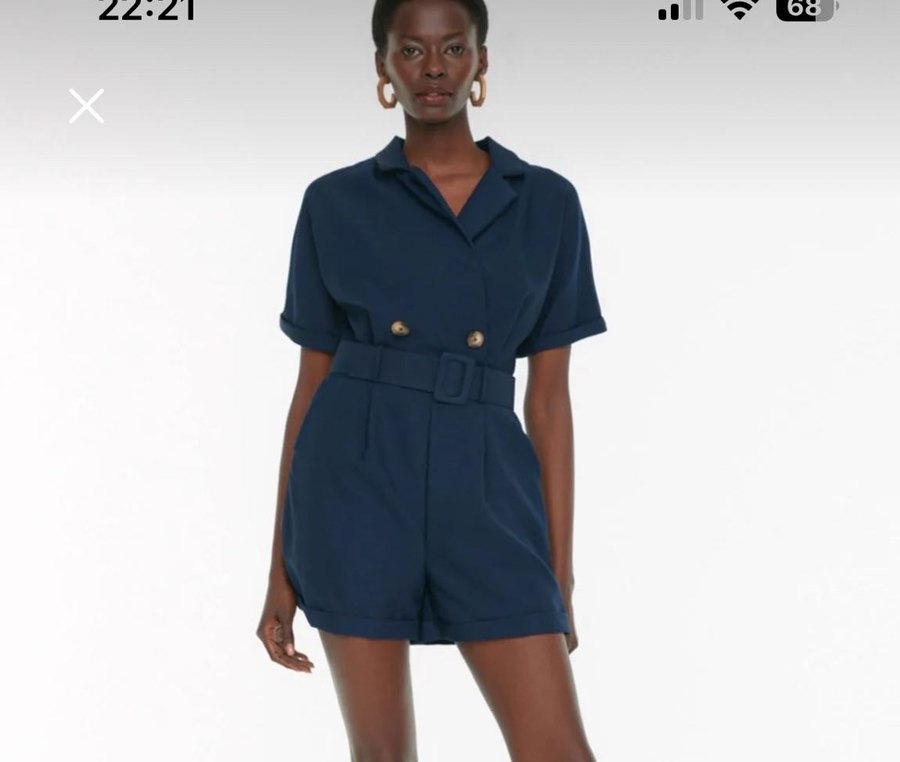 Lacivert kısa denim tulum, kısa kollu, kemerli ve yakalıdır. Rahat kesimi ve mini boyu ile günlük sokak stiline uygundur.