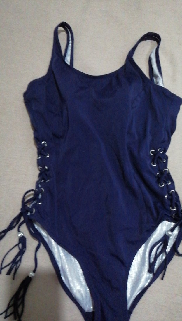 Lacivert, kemerli, askılı ve yanları bağcıklı, vücuda oturan mayo. DAGI marka