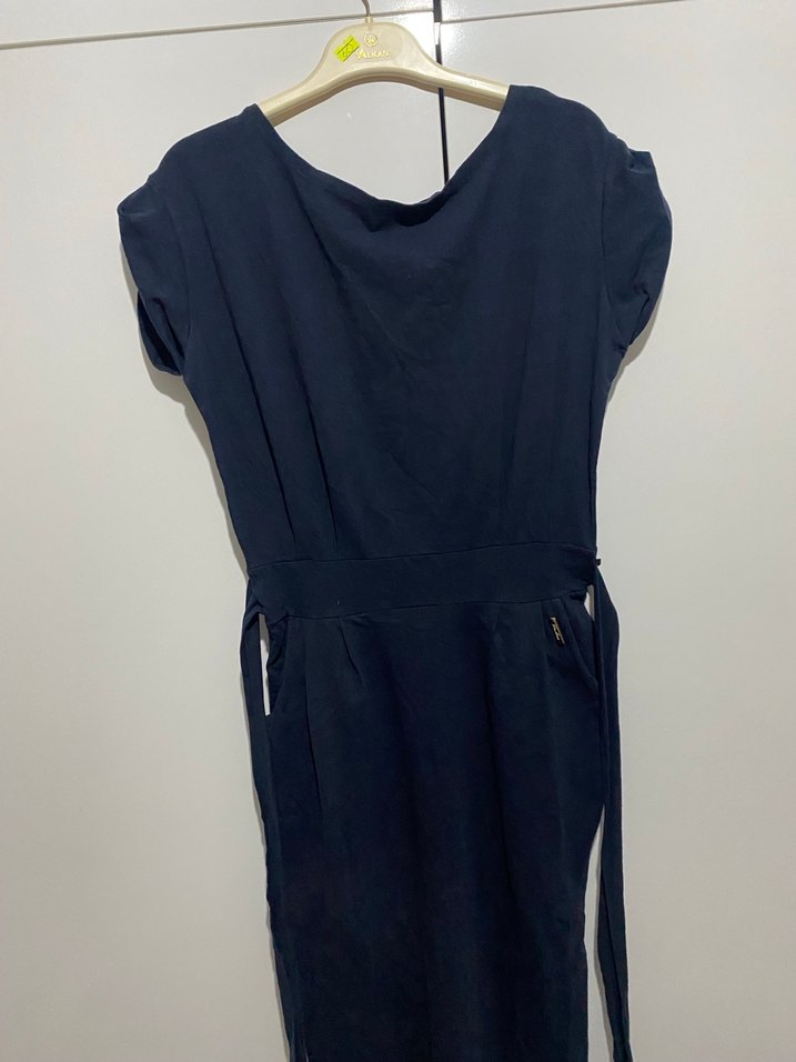 Lacivert renk, kemerli ve kısa kollu midi uzunlukta, vücuda oturan kesime sahip kadın elbisesi. Günlük kullanıma uygun, sentetik dokulu kumaştan üretilmiştir.