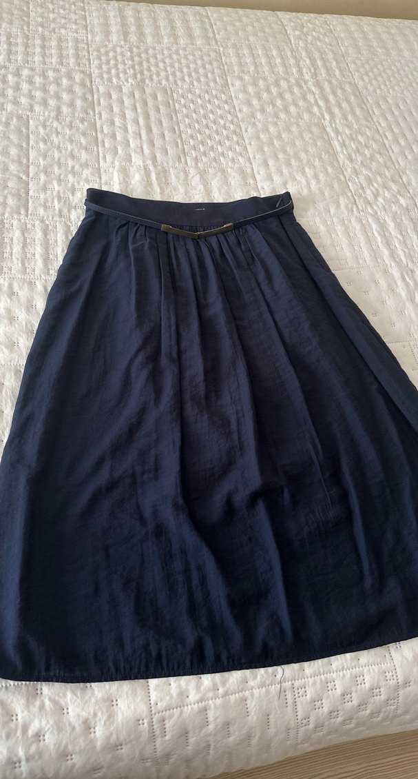 Lacivert renkli midi boy, keten kumaştan, kemerli ve bol kesim etek. Minimalist ve bohem tarzda, günlük kullanıma uygun.iç astarlı ürün boy 72 cm
