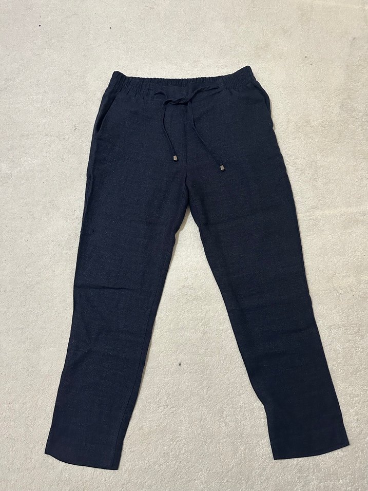 Lacivert, beli arkadan lastikli, bol kesim keten pantolon. Günlük kullanıma uygun midi boy ve rahat normcore tarzı sunar.