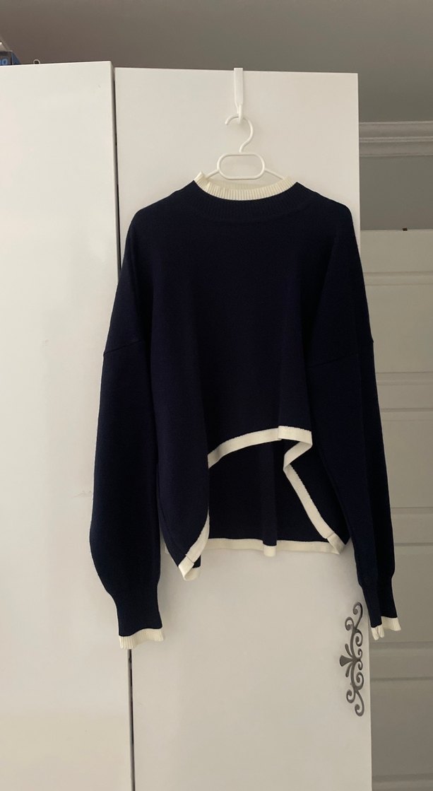 Lacivert triko kazak, beyaz kenar detaylı, yuvarlak yaka ve uzun kollu. Rahat, bol kesim ve midi boyda, günlük kullanıma uygun.
