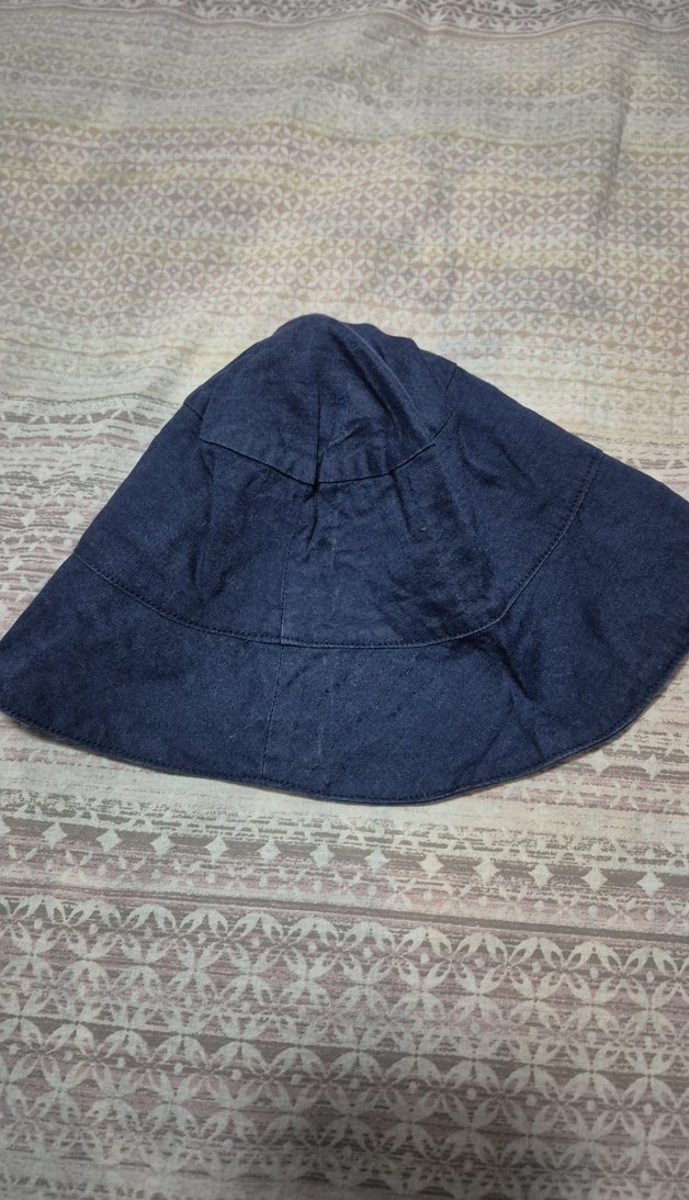 Lacivert keten kumaştan yapılmış şapka. El yapımı. Lastiği vardı. esneyince kestik. Siz de ekleyebilirsiniz. 2 3 yaş