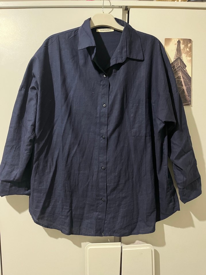 Lacivert keten kumaştan yapılmış, uzun kollu ve düğmeli, yakalı kadın gömleği. Rahat kesimi ve normal midi boyuyla günlük kullanıma uygundur.