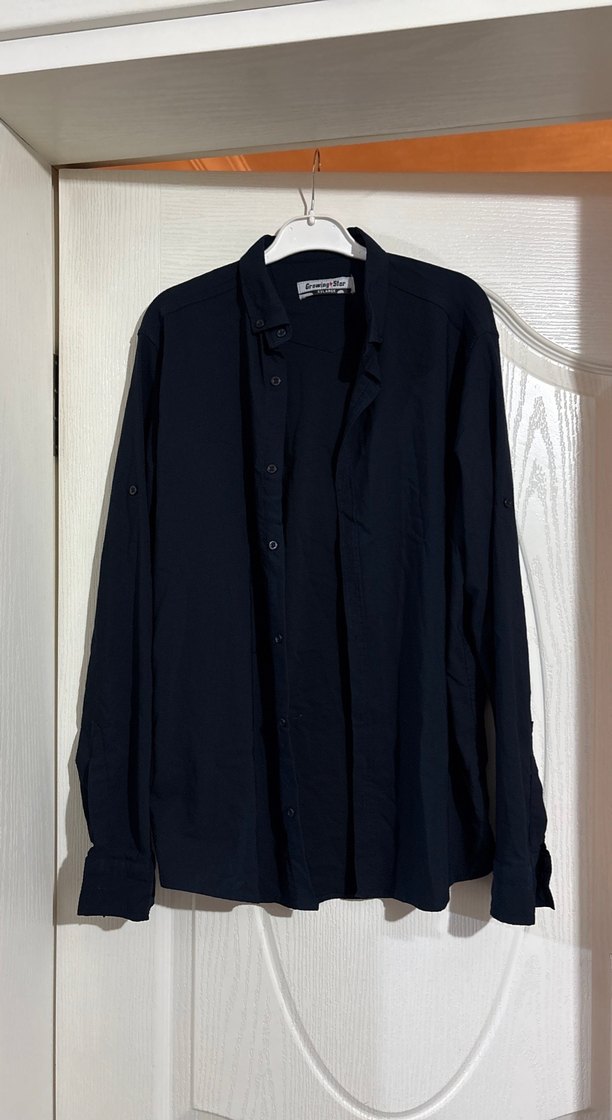 Lacivert keten kumaştan, düğmeli, uzun kollu, regular fit ve minimal tarzda günlük kullanıma uygun erkek gömleği.