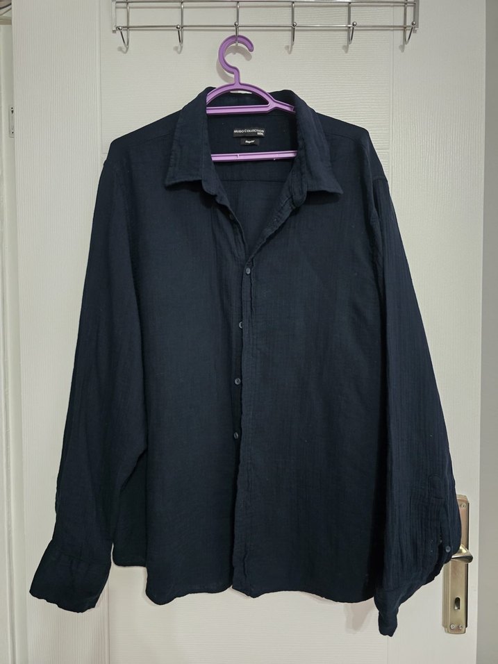 Lacivert keten erkek gömlek, düğmeli, uzun kollu ve yakalıdır. Rahat kesimi ve midi uzunluğu ile ofis kullanımı için uygundur.