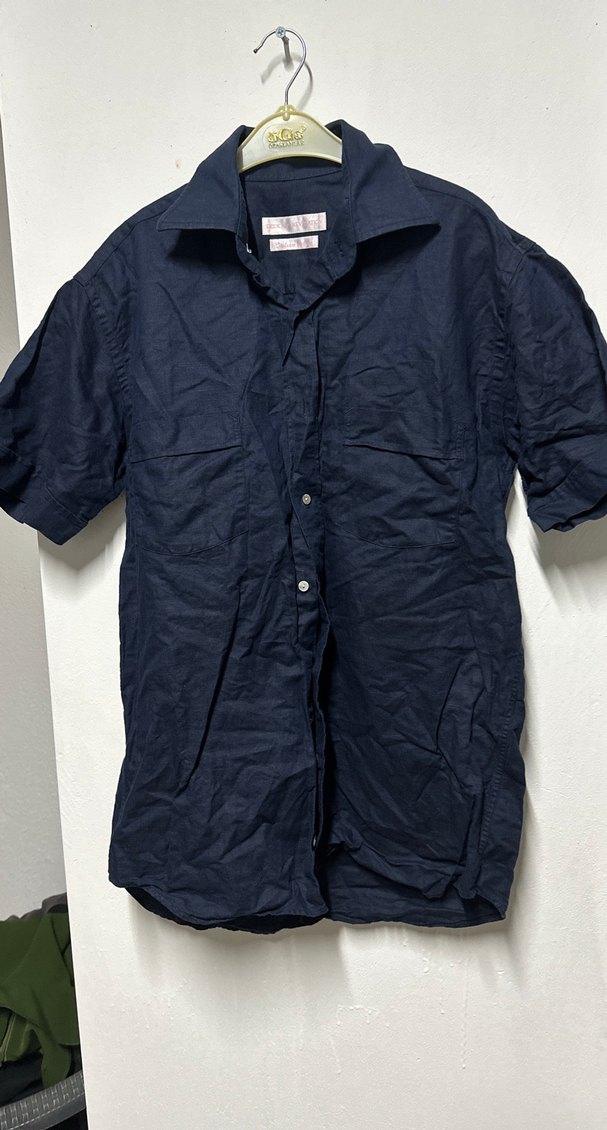 Lacivert keten erkek gömlek, yakalı ve düğmeli tasarıma sahiptir. Kısa kollu, bol kesim ve normal boydadır, günlük rahat stil için uygundur.
